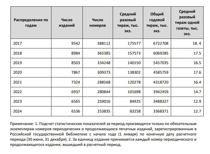 Что касается тиражей российских газет (по оценкам ИИ и экспертов медиа рынка), тиражи падают десятый год подряд, демонстрируя устойчивую тенденцию к снижению из-за цифровизации, роста производственных расходов и падения спроса. По итогам 2023−2024 годов общий годовой тираж сократился на 10−12%. Бумажная пресса становится анахронизмом, при этом только основная аудитория сохраняется в малых городах и сельской местности.